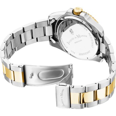 This Jacques du Manoir watch has a case made of stainless steel with a diameter of 43 mm and is fitted with a stainless steel band. Inside the case lies a Ronda movement and the watch features a Mineral crystal.
