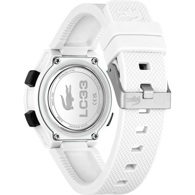 This Lacoste watch has a case made of Resin with a diameter of 34 mm and is fitted with a rubber band.