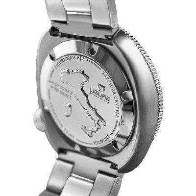 In the Mediterranean off the coast of Liguria, many species of turtles can be found. The shape of their shield inspired the design of the Ligure Tartaruga watch. Like with a turtle shield, the case slightly overlaps the neck, or in this case, the bracelet giving the watch its distinct look. Another typical feature of Ligure watches are the applique indexes filled with Swiss Super LumiNova X-grade with a, technically very difficult to execute, red color accent. The indexes are are complemented by sturdy sword-shaped hands in the same style. Travel in style to ‘Bella Italia’ with this practical and sophisticated diving watch.