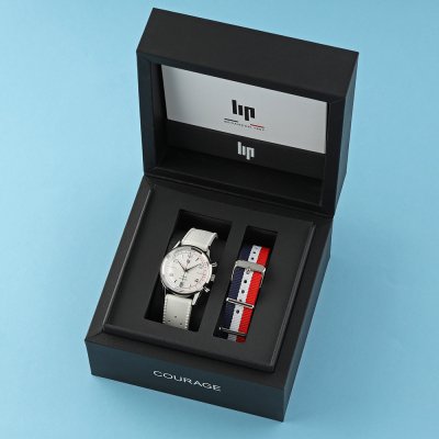 The LIP Courage watch has been developed in partnership with the Fédération Nationale des Sapeurs-Pompiers de France (FNSPF). Besides functioning as a regular watch, the watch can also be used as a decision-making tool for first-aid professionals: firefighters, doctors, nurses and first-aiders. The chronograph movement, with a dual hand measures heartbeat on the red scale and breathing on the blue scale, which enables vital functions* to be monitored very quickly.