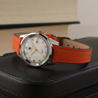 This LIP watch has a case made of stainless steel with a diameter of 29 mm and is fitted with a leather band. Inside the case lies a Ronda movement and the watch features a K1 Mineral crystal.
