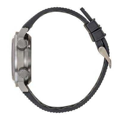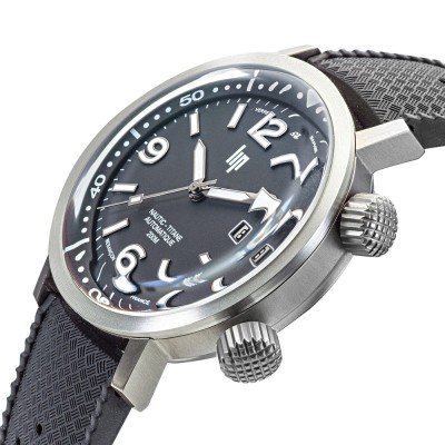 This LIP watch has a case made of titanium with a diameter of 41 mm and is fitted with a rubber band. Inside the case lies a Miyota movement and the watch features a Single anti-reflective sapphire crystal.