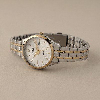 This Lorus watch has a case made of stainless steel with a diameter of 30 mm and is fitted with a stainless steel band. Inside the case lies a Seiko Instruments Inc. movement and the watch features a Hardlex crystal crystal.