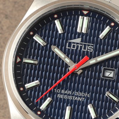 This Lotus watch has a case made of stainless steel with a diameter of 42 mm and is fitted with a stainless steel band. Inside the case lies a Miyota movement and the watch features a Mineral crystal.