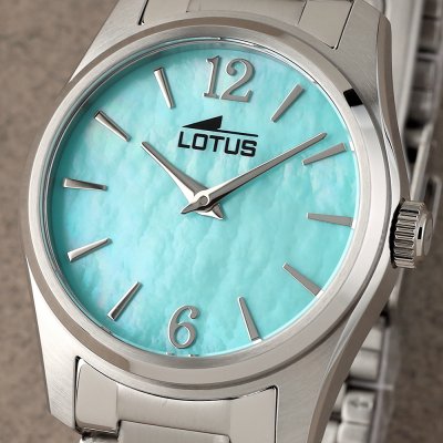 This Lotus watch has a case made of stainless steel with a diameter of 32 mm and is fitted with a stainless steel band. Inside the case lies a Miyota movement and the watch features a Mineral crystal.