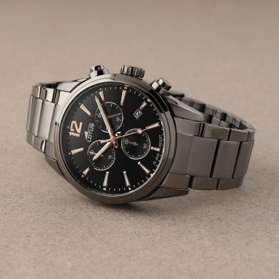 This Lotus watch has a case made of stainless steel with a diameter of 42 mm and is fitted with a stainless steel band. Inside the case lies a Miyota movement and the watch features a Mineral crystal.