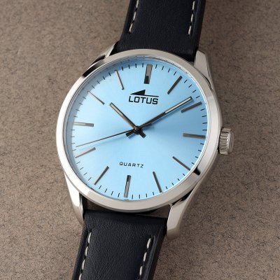 This Lotus watch has a case made of stainless steel with a diameter of 42 mm and is fitted with a leather band. Inside the case lies a Miyota movement and the watch features a Mineral crystal.