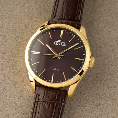 This Lotus watch has a case made of stainless steel with a diameter of 42 mm and is fitted with a leather band. Inside the case lies a Miyota movement and the watch features a Mineral crystal.