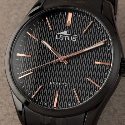 This Lotus watch has a case made of stainless steel with a diameter of 42 mm and is fitted with a stainless steel band. Inside the case lies a Miyota movement and the watch features a Mineral crystal.