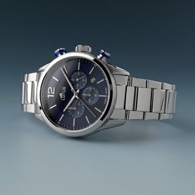 This Lotus watch has a case made of stainless steel with a diameter of 43 mm and is fitted with a stainless steel band. Inside the case lies a Miyota movement and the watch features a Mineral crystal.