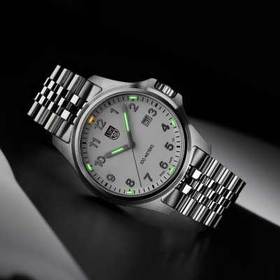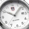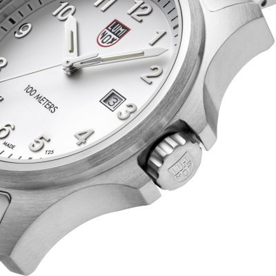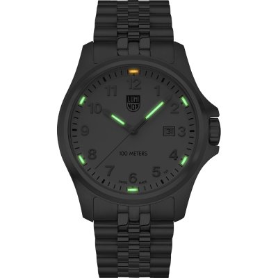 This Luminox watch has a case made of stainless steel with a diameter of 43 mm and is fitted with a stainless steel band. Inside the case lies a Ronda movement and the watch features a Single anti-reflective sapphire crystal.