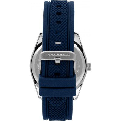 This Maserati watch has a case made of stainless steel with a diameter of 43 mm and is fitted with a rubber band. Inside the case lies a Miyota movement and the watch features a Mineral crystal.