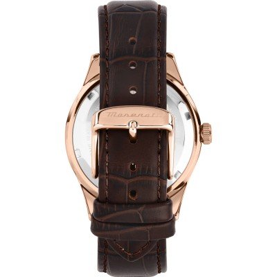 This Maserati watch has a case made of stainless steel with a diameter of 42 mm and is fitted with a leather band. Inside the case lies a Miyota movement and the watch features a Mineral crystal.