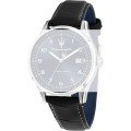 This Maserati watch has a case made of stainless steel with a diameter of 42 mm and is fitted with a leather band. Inside the case lies a Miyota movement and the watch features a Mineral crystal.