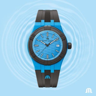 This Maurice Lacroix watch has a case made of #Tide ocean plastic with a diameter of 40 mm and is fitted with a rubber band. Inside the case lies a Ronda movement and the watch features a Double anti-reflective sapphire crystal.