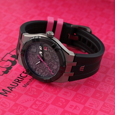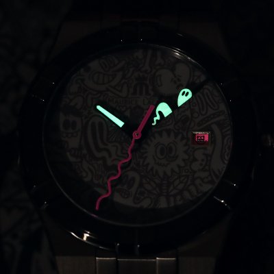 This super fun Aikon watch was designed in collaboration with British street artist Wotto, fusing Swiss watchmaking expertise with Wotto's unbridled creative universe. Wotto was given complete creative freedom to create his own graphic universe. On a simple gray background we find his mischievous characters. The minute hand has been taken over by a ghost and the second hand is a striking wobbling pink line. Other pink accents are the date window which is occupied by another one of Wotto’s creatures and the pink rubber keeper with his logo. With only 500 of these watches produced it is a unique opportunity to own a very unusual, collectable piece of art!