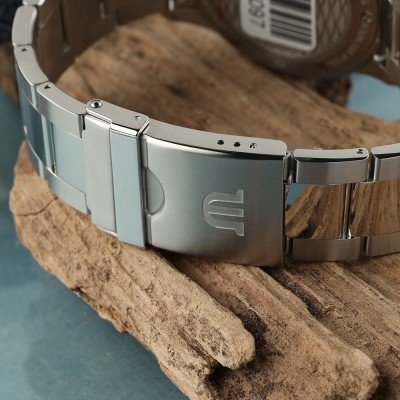 This Maurice Lacroix watch has a case made of stainless steel with a diameter of 43 mm and is fitted with a stainless steel band. Inside the case lies a Sellita movement and the watch features a Sapphire crystal.