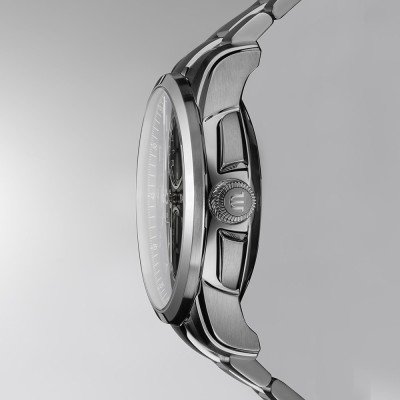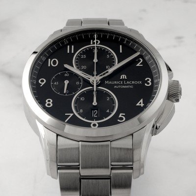This Maurice Lacroix watch has a case made of stainless steel with a diameter of 43 mm and is fitted with a stainless steel band. Inside the case lies a ETA movement and the watch features a Double anti-reflective sapphire crystal.