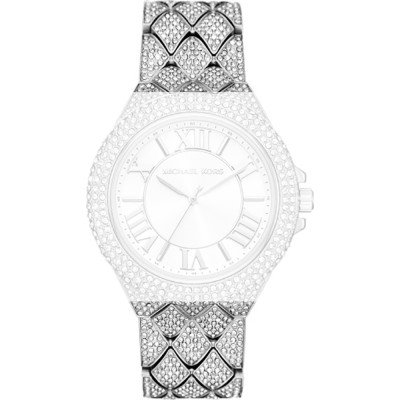 This Michael Kors watch strap is made of stainless steel and is attached to the watch by means of steel pins. The band has a width of 22 mm and is closed by means of a butterfly clasp with push buttons. The strap has no straight mount which means that this strap is only suitable for the watches listed below.