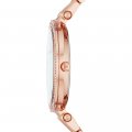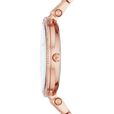 This Michael Kors watch has a case made of stainless steel with a diameter of 39 mm and is fitted with a metal band. Inside the case lies a Miyota movement and the watch features a Mineral crystal.