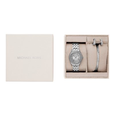 This Michael Kors watch has a case made of stainless steel with a diameter of 33 mm and is fitted with a stainless steel band. Inside the case lies a Miyota movement and the watch features a Mineral crystal.