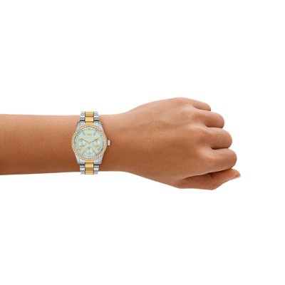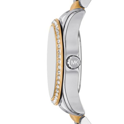 This Michael Kors watch has a case made of stainless steel with a diameter of 34 mm and is fitted with a stainless steel band. Inside the case lies a Miyota movement and the watch features a Mineral crystal.