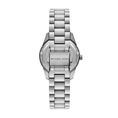 This Michael Kors watch has a case made of stainless steel with a diameter of 34 mm and is fitted with a stainless steel band. Inside the case lies a Miyota movement and the watch features a Mineral crystal.