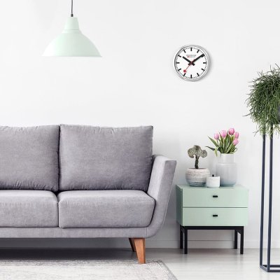 This Stop2go wall clock has the same functionality as an original Swiss Railway station clock, the red second hand stops for 2 seconds when it reaches 12 o'clock, before jumping to the next minute.