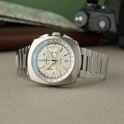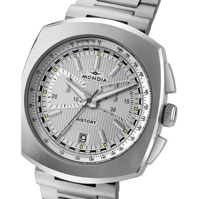 This Mondia watch has a case made of stainless steel with a diameter of 40 mm and is fitted with a stainless steel band. Inside the case lies a Ronda movement and the watch features a Mineral crystal.