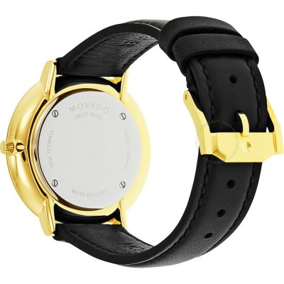 This Movado watch has a case made of stainless steel with a diameter of 35 mm and is fitted with a leather band. Inside the case lies a ETA movement and the watch features a Sapphire crystal.
