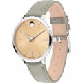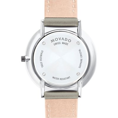 This Movado watch has a case made of stainless steel with a diameter of 35 mm and is fitted with a leather band. Inside the case lies a ETA movement and the watch features a Sapphire crystal.