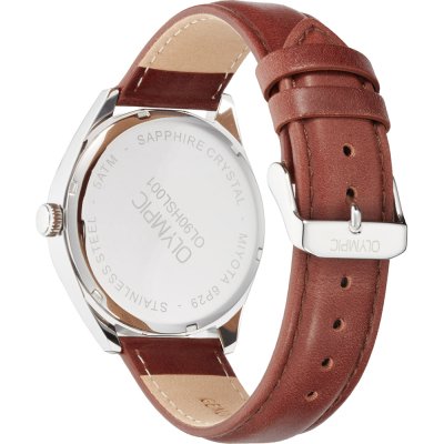 This Olympic watch has a case made of stainless steel with a diameter of 40 mm and is fitted with a leather band. Inside the case lies a Miyota movement and the watch features a Sapphire crystal.
