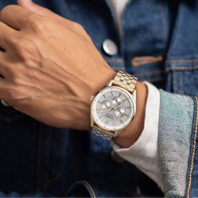 This Olympic watch has a case made of stainless steel with a diameter of 40 mm and is fitted with a stainless steel band. Inside the case lies a Miyota movement and the watch features a Sapphire crystal.