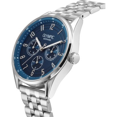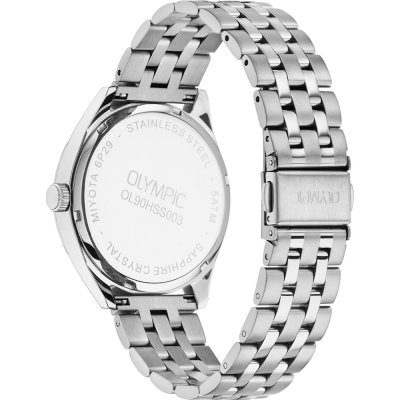 This Olympic watch has a case made of stainless steel with a diameter of 40 mm and is fitted with a stainless steel band. Inside the case lies a Miyota movement and the watch features a Sapphire crystal.
