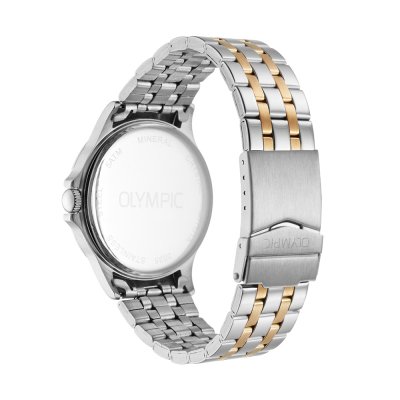 This Olympic watch has a case made of stainless steel with a diameter of 40 mm and is fitted with a stainless steel band. Inside the case lies a Miyota movement and the watch features a Mineral crystal.