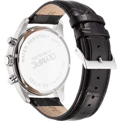 This Olympic watch has a case made of stainless steel with a diameter of 40 mm and is fitted with a leather band. Inside the case lies a Seiko Instruments Inc. movement and the watch features a Mineral crystal.