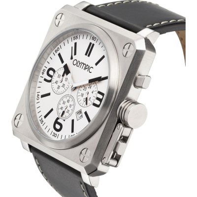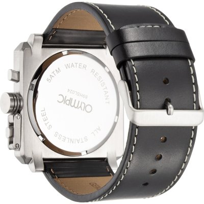 This Olympic watch has a case made of stainless steel with a diameter of 46 mm and is fitted with a leather band. Inside the case lies a Miyota movement and the watch features a Mineral crystal.