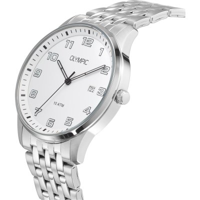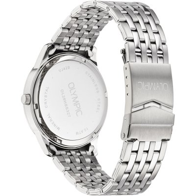 This Olympic watch has a case made of stainless steel with a diameter of 42 mm and is fitted with a stainless steel band. Inside the case lies a Seiko Instruments Inc. movement and the watch features a Mineral crystal.