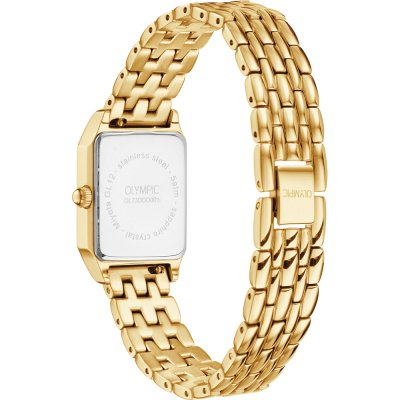 This Olympic watch has a case made of stainless steel with a diameter of 33 mm and is fitted with a stainless steel band. Inside the case lies a Miyota movement and the watch features a Sapphire crystal.
