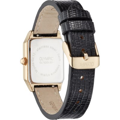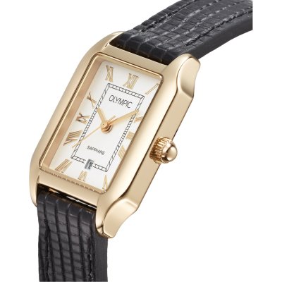 This Olympic watch has a case made of stainless steel with a diameter of 33 mm and is fitted with a leather band. Inside the case lies a Miyota movement and the watch features a Sapphire crystal.