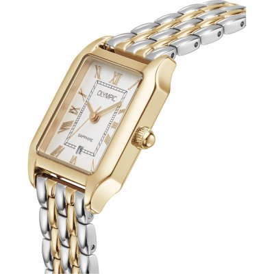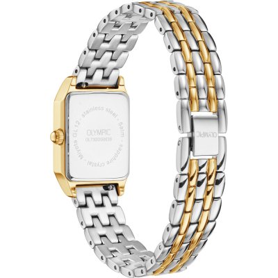 This Olympic watch has a case made of stainless steel with a diameter of 33 mm and is fitted with a stainless steel band. Inside the case lies a Miyota movement and the watch features a Sapphire crystal.
