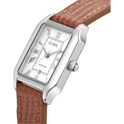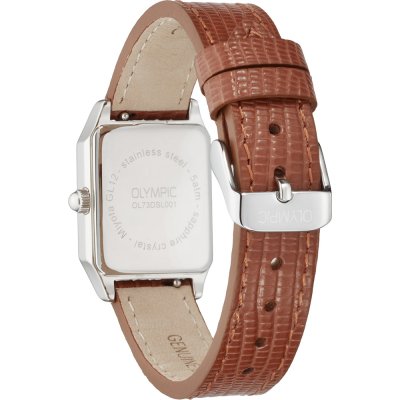 This Olympic watch has a case made of stainless steel with a diameter of 33 mm and is fitted with a leather band. Inside the case lies a Miyota movement and the watch features a Sapphire crystal.
