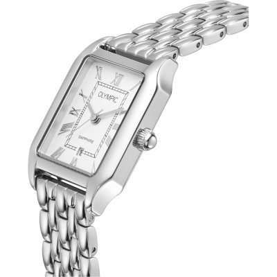 This Olympic watch has a case made of stainless steel with a diameter of 33 mm and is fitted with a stainless steel band. Inside the case lies a Miyota movement and the watch features a Sapphire crystal.