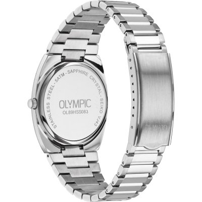 This Olympic watch has a case made of stainless steel with a diameter of 36 mm and is fitted with a stainless steel band. Inside the case lies a Seiko Instruments Inc. movement and the watch features a Sapphire crystal.