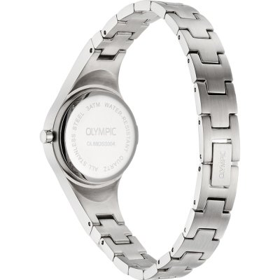 This Olympic watch has a case made of stainless steel with a diameter of 26 mm and is fitted with a stainless steel band. Inside the case lies a Seiko movement and the watch features a Mineral crystal.