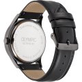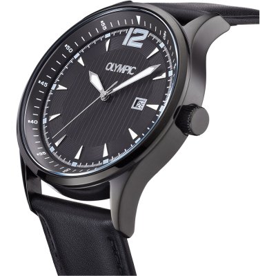 This Olympic watch has a case made of stainless steel with a diameter of 43 mm and is fitted with a leather band. Inside the case lies a Miyota movement and the watch features a Mineral crystal.