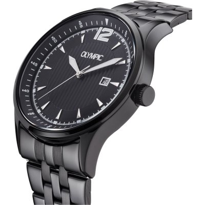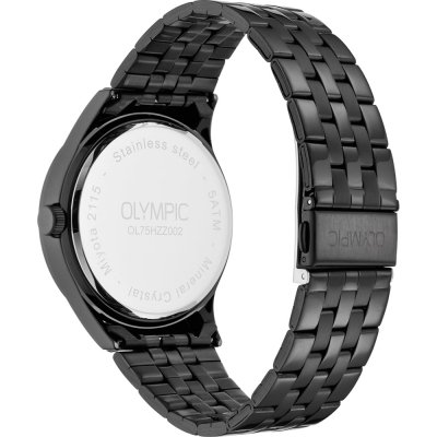 This Olympic watch has a case made of stainless steel with a diameter of 43 mm and is fitted with a stainless steel band. Inside the case lies a Miyota movement and the watch features a Mineral crystal.
