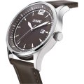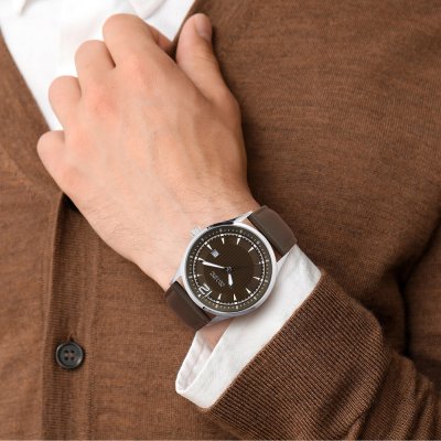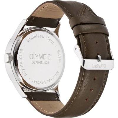 This Olympic watch has a case made of stainless steel with a diameter of 43 mm and is fitted with a leather band. Inside the case lies a Miyota movement and the watch features a Mineral crystal.