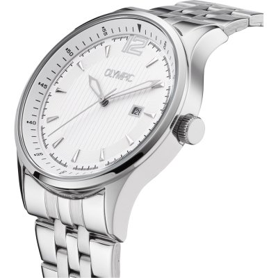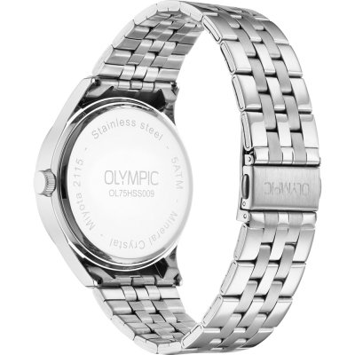 This Olympic watch has a case made of stainless steel with a diameter of 43 mm and is fitted with a stainless steel band. Inside the case lies a Miyota movement and the watch features a Mineral crystal.