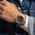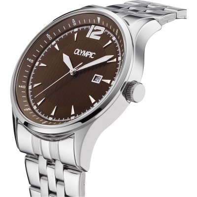 This Olympic watch has a case made of stainless steel with a diameter of 43 mm and is fitted with a stainless steel band. Inside the case lies a Miyota movement and the watch features a Mineral crystal.